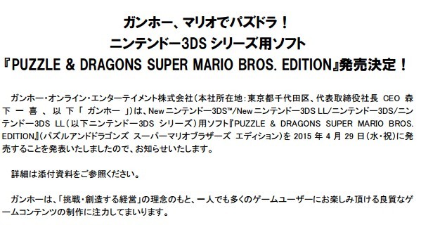 本作は、“すれちがい通信”や“ローカル通信”といったニンテンドー3DS シリーズならではの要素も搭載しており、 『パズル&ドラゴンズ』をご愛顧いただいているユーザー様はもちろん、スマートフォンをお持ちでない方やお子様など、 ご家族で安心してお楽しみいただける(※3)内容となっております。「スーパーマリオブラザーズ」を題材とした ゲーム作品として、その世界観や音楽、キャラクター表現に徹底的にこだわって制作した本作に是非ご期待ください。