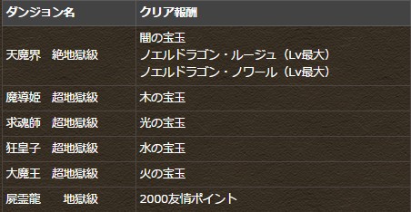 「デビルチャレンジ!【ノーコン】」ダンジョンでは、クリアしたフロアの「ダンジョンクリア報酬」(下記に記載)を、ゲーム内メールでプレゼント!さらに、「天魔界 絶地獄級」のフロアは、3つの報酬がもらえるぞ!