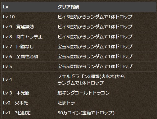 ※ダンジョン名は全て「一度きりチャレンジ!【ノーコン】」で出現し、フロア名が各Lvごとに違う表記となっています。