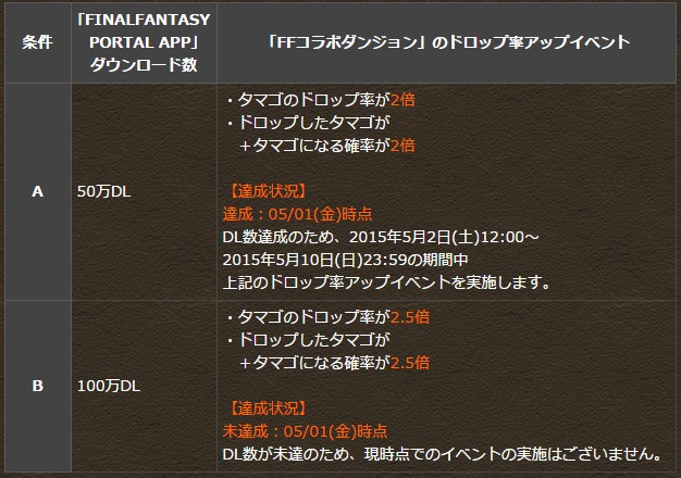 「FINAL FANTASY PORTAL APP」のダウンロード数は、 パズドラ公式サイトおよびパズドラ公式Twitterアカウント 「パズル&ドラゴンズ公式(@pad_sexy)」に おいて発表いたします。 また、発表した結果にあわせ、以下のスケジュールで 「FFコラボダンジョン」のドロップ率アップイベントを 実施します。