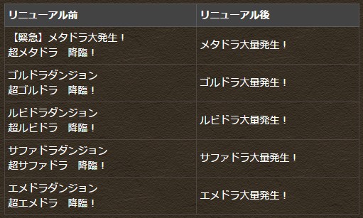 今回から 「メタドラ大発生!」や「超ルビドラ 降臨!」など 一部のゲリラダンジョンをリニューアル! 1つのダンジョンに2つのフロアが出現するようになるぞ! さらに、イベント時に実施していた 「キングとの遭遇率2倍」を通常化!