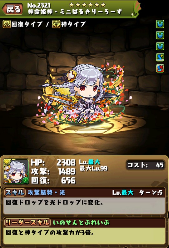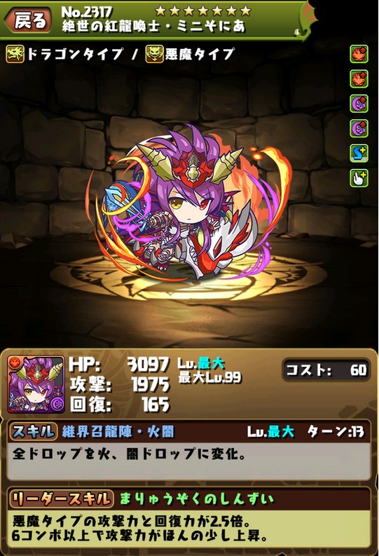 悪魔タイプの攻撃力と回復力2.5倍。6コンボ以上で攻撃力がほんの少し上昇。