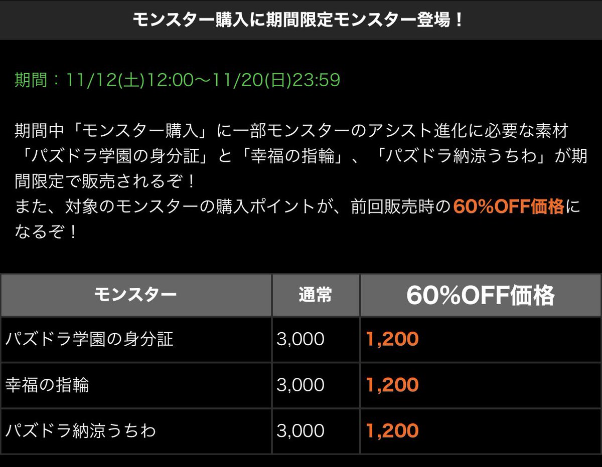 また今回は、一部モンスターのアシスト進化に必要な素材「パズドラ学園の身分証」なども、前回販売時の60%OFF価格で販売されるぞ!
