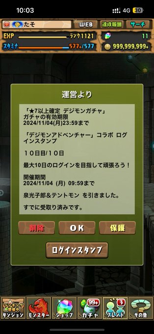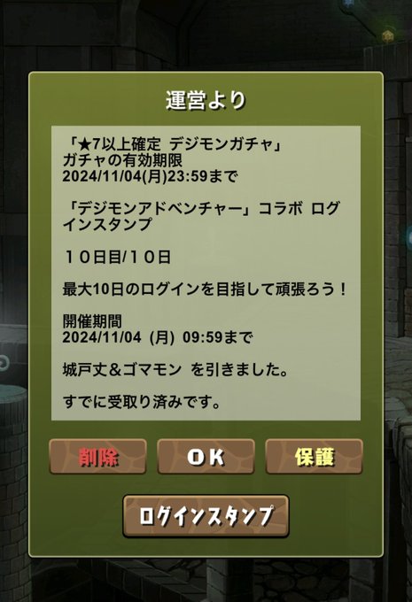 「デジモンアドベンチャーガチャ」など、期間中のログイン日数に応じた報酬がゲーム内メールに届くぞ!