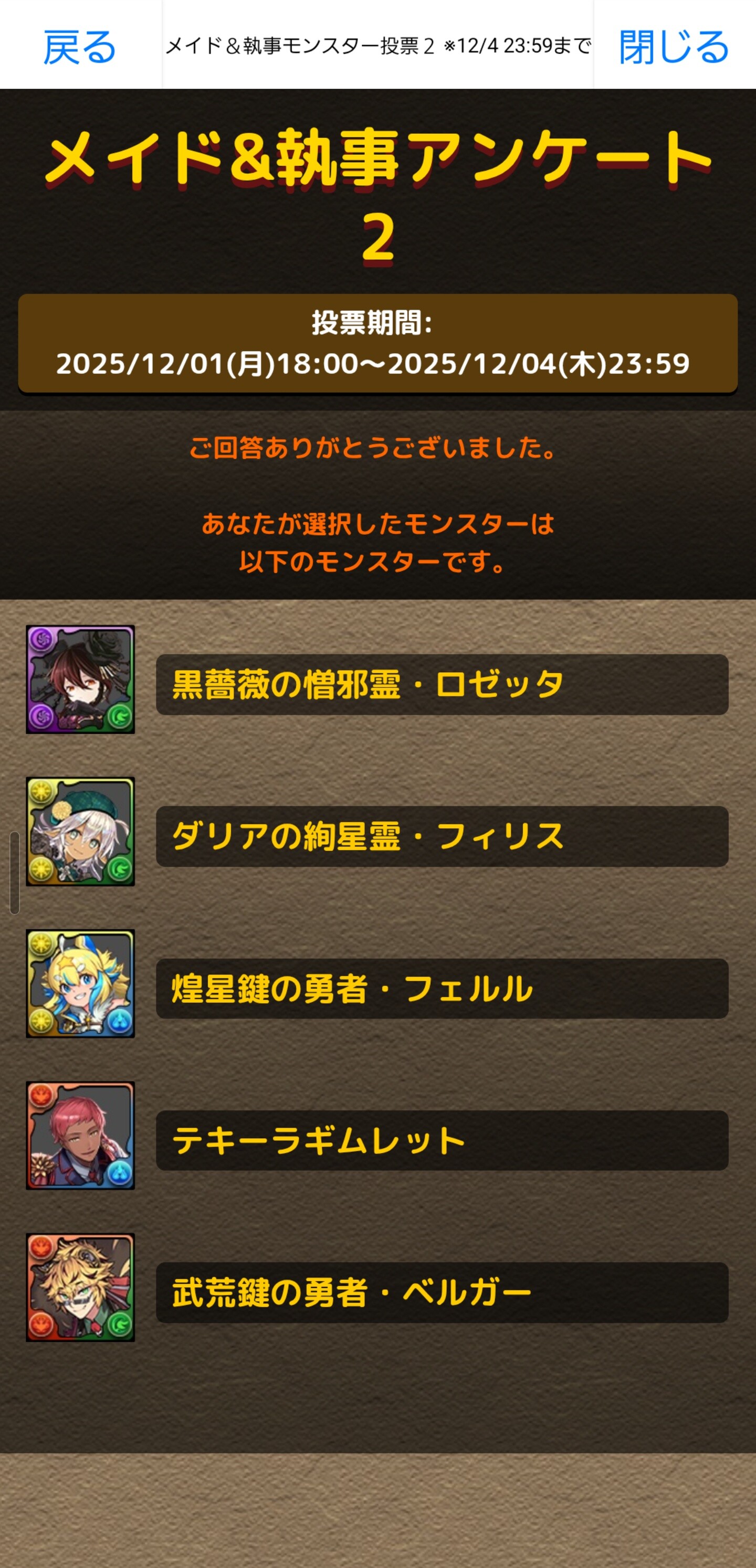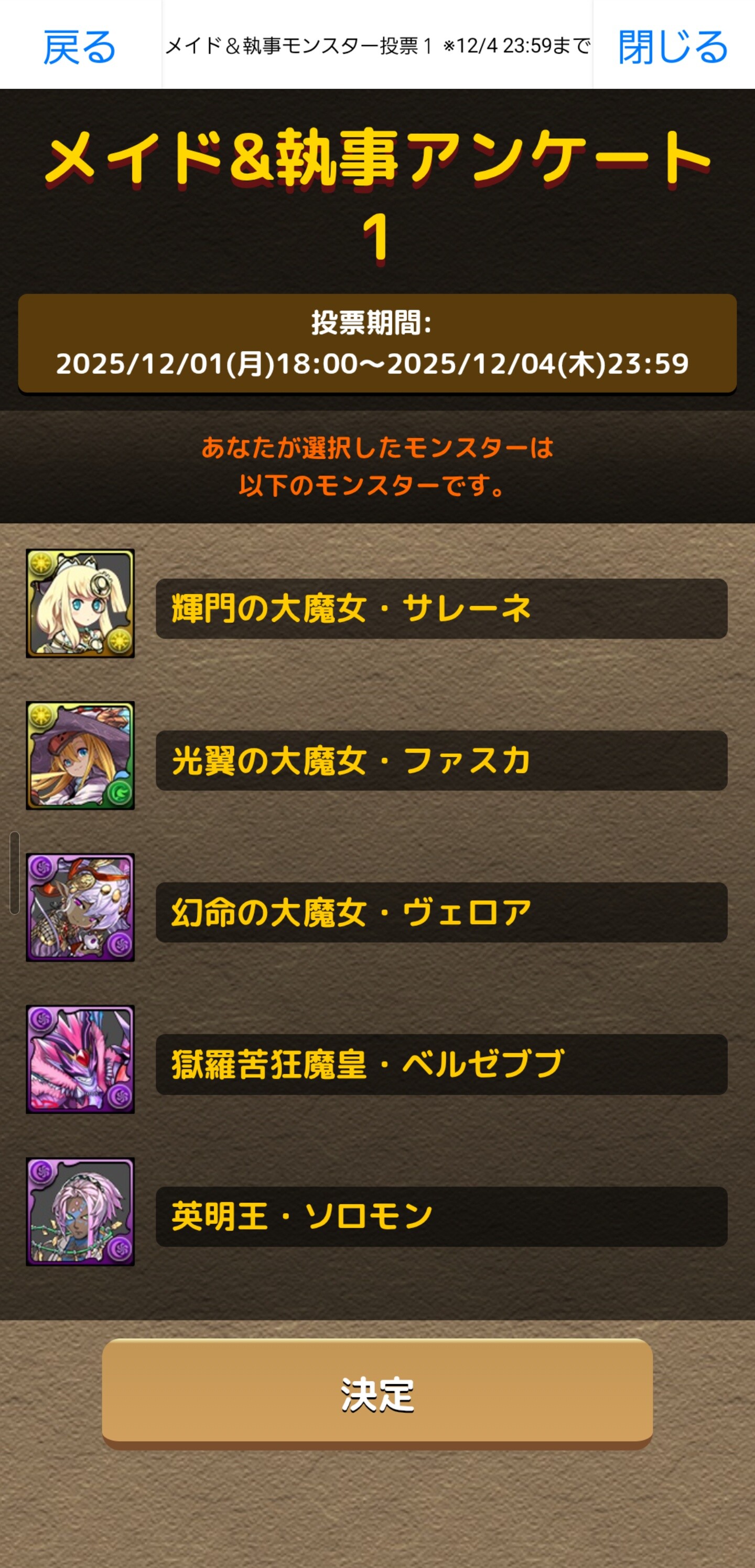 「メイド&執事アンケート1」ではガチャやダンジョンモンスターを、「メイド&執事アンケート2」では期間限定イベントモンスターを選択できます。