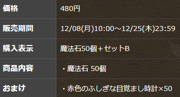 480円で「魔法石50個」と、おまけの「赤色のふしぎな目覚まし時計×50」を入手できる、超ウルトラお得な「クリスマススペシャルセット」を魔法石ショップにて販売!